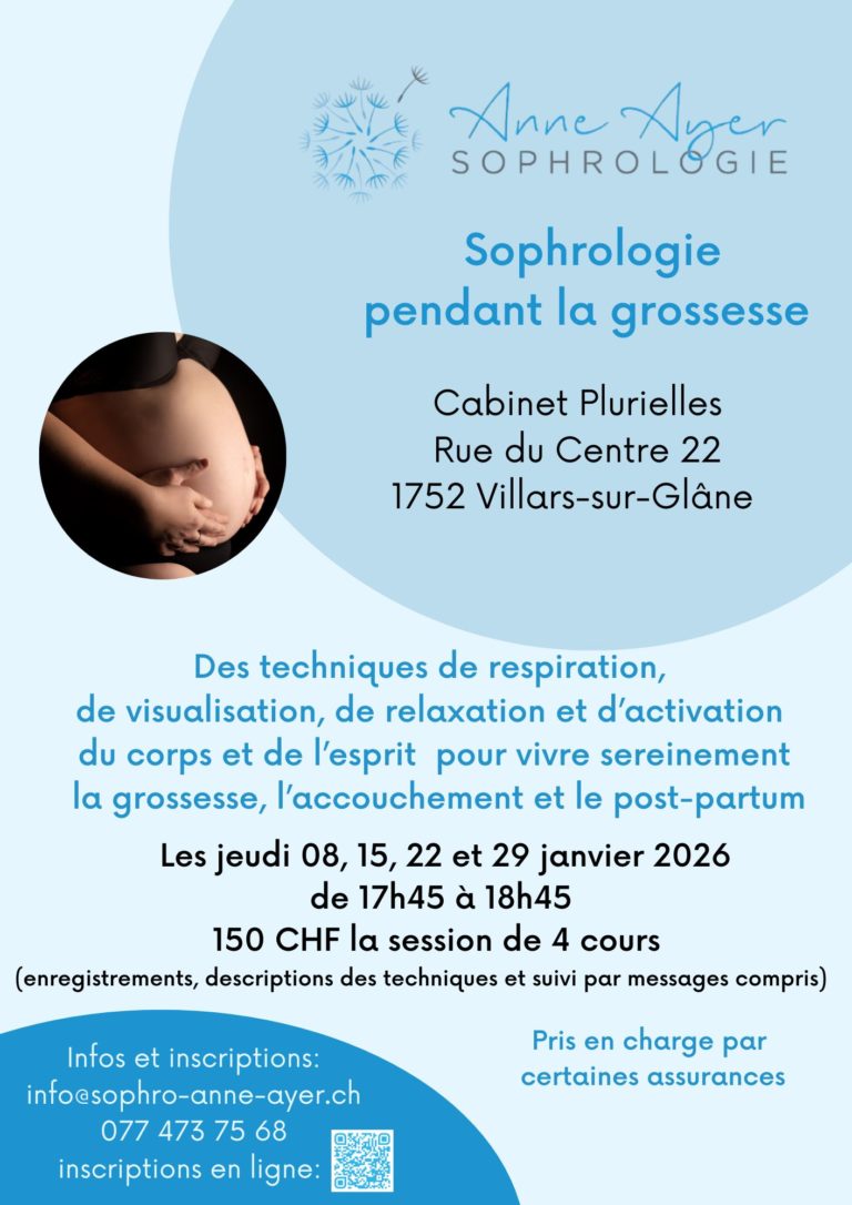 Sessions de cours de “Sophrologie pendant la grossesse” (3x1h) au cabinet Plurielles à Villars-sur-Glâne